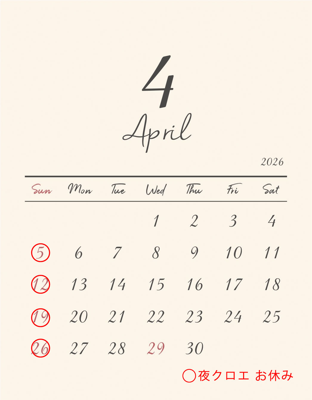 4月の営業日 日曜定休